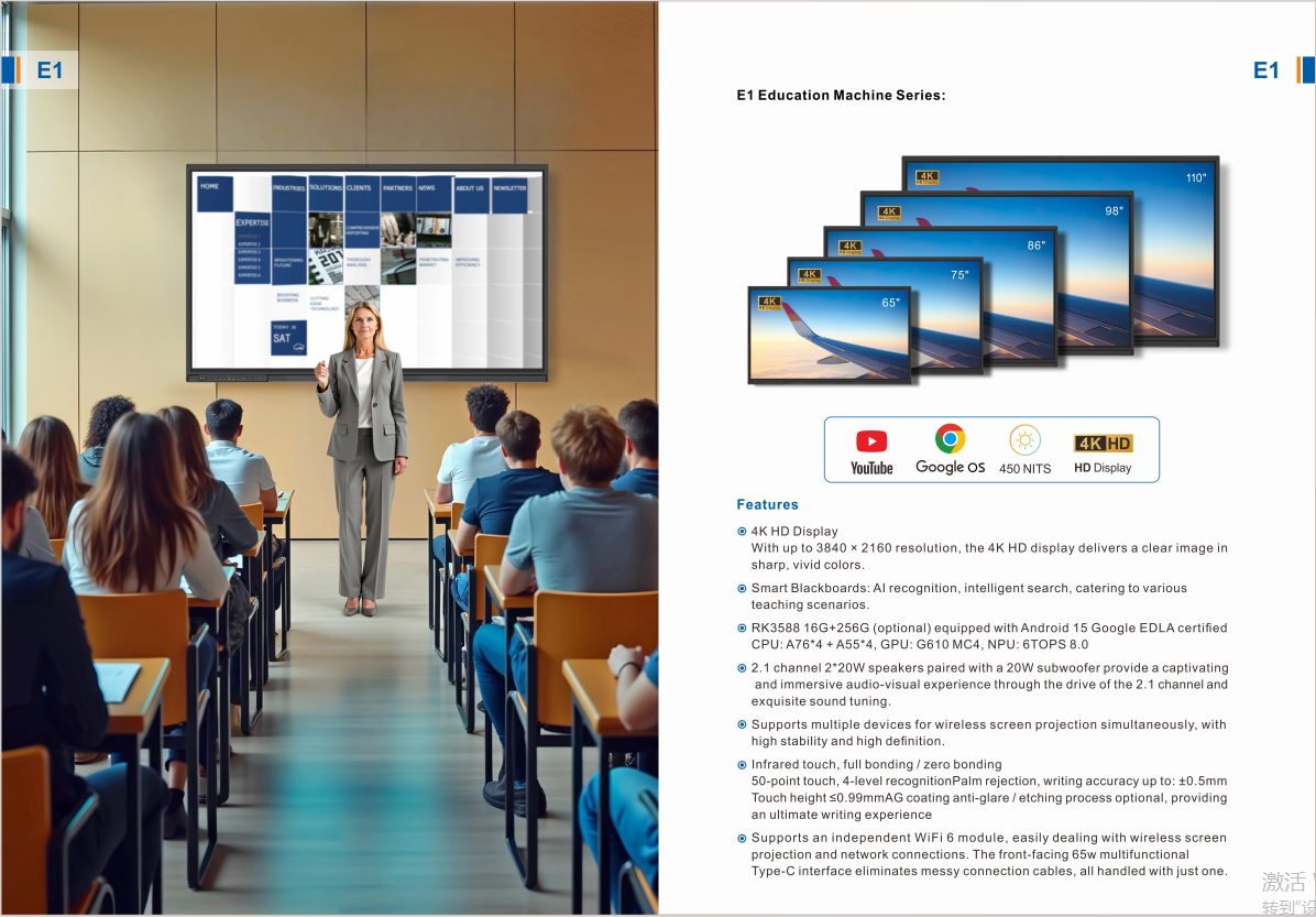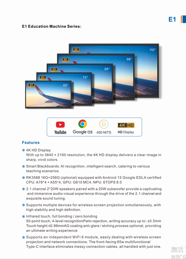 - Described:RK3588 16G+256G (optional) Android 15 Google EDLA CPU: A76*4+A55*4 GPU: G610MC4 NPU: 6TOPS8.0 Built-in 50MP AI camera + 8 array microphones, supporting gesture recognition and dynamic sensing, easily handling meeting and teaching scenarios. Infrared touch, full/zero bonding, 50-point touch, 5-level recognition, anti-tampering, writing accuracy up to ±0.5mm, touch height less than 0.99mm, AG coating anti-glare/etching process optional, providing the ultimate writing experience.