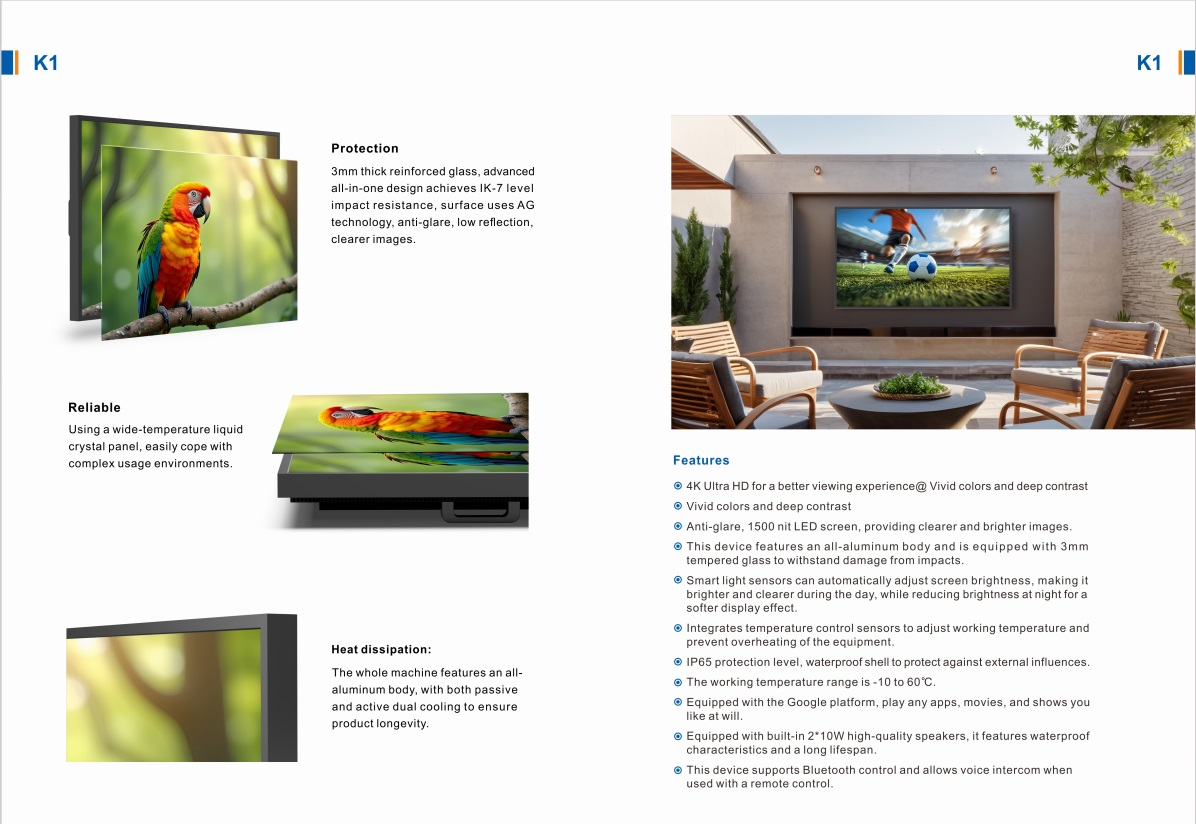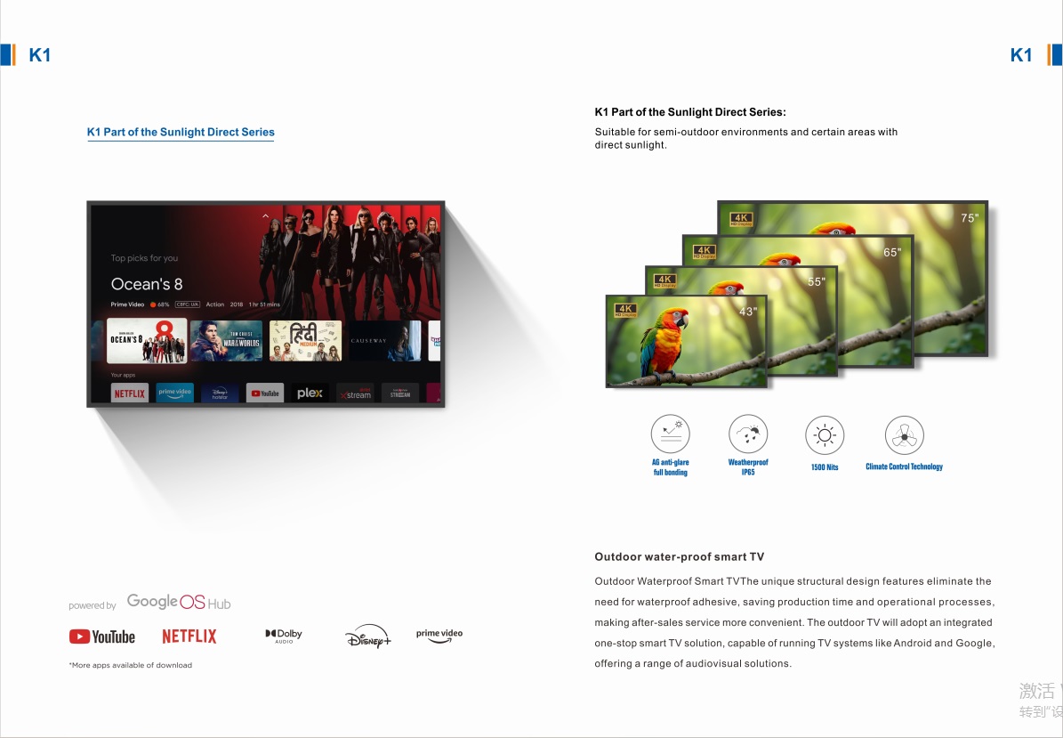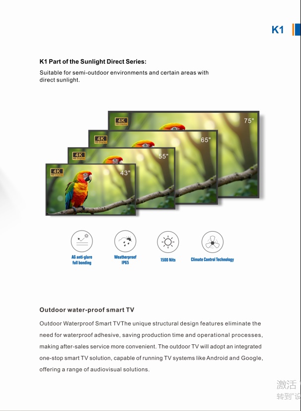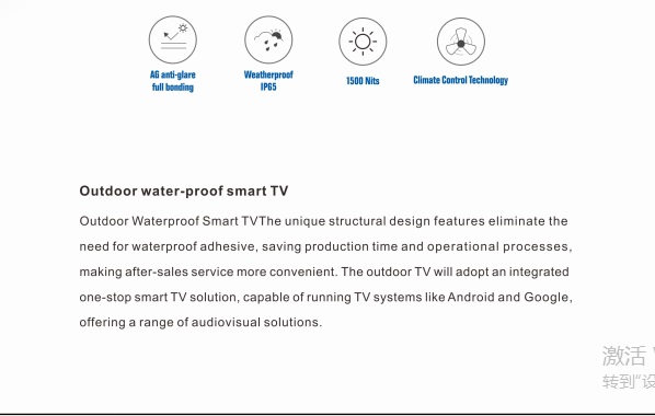- Described:The unique structural design of this outdoor waterproof smart TV eliminates the need for waterproof adhesives, saving production time and operational processes, and making after-sales service more convenient. This outdoor TV will adopt an integrated, one-stop smart TV solution, capable of running TV systems such as Android and Google, and providing a variety of audio-visual solutions. It is suitable for semi-outdoor environments and some areas without direct sunlight.