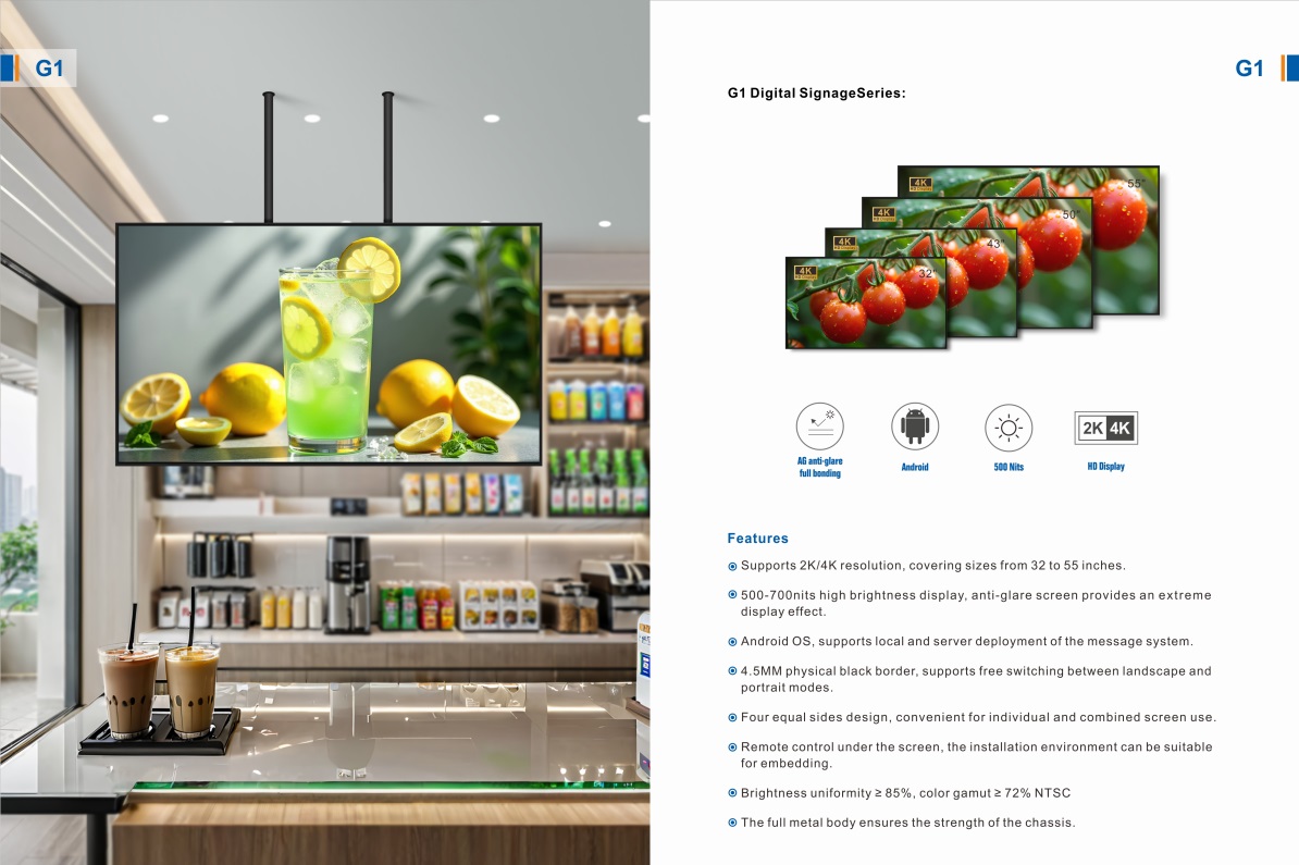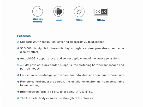 - Described:This product is part of our standard series, available in four universal sizes: 32, 43, 50, and 55 mm. Its ultra-narrow 4.5mm bezel with independent corners makes it widely applicable in restaurants, aisles, and exhibition halls. This model integrates mainstream Android technology and offers optional embedded standalone, embedded network, and monitor motherboard solutions to meet market application requirements.